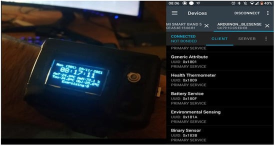 In the present study, the MEMS accelerometer undertook the acquisition of acceleration data, aiming to categorize the activity status of the user through the CDA model. Depending on this status, the temperature threshold was adjusted accordingly. More specifically, if physical exercise is detected, the fever threshold was increased by approximately 0.5–1.0 °C. Afterwards, in case of febrility, the alert message was automatically sent to the user. The most significant information was displayed through an OLED screen and also sent to the user’s cellphone via BLE. Using the central application allowed us to connect to the Wearable device and read the published services, which were updated and then published every 2 s, allowing us to continuously monitor the patient and keep an eye on each parameter. Figure 1 illustrates the prototype being worn, along with the interface providing information about the device’s sensors.