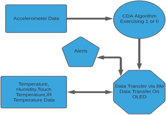 The primary protocols used to transmit the information are BLE and were used as peripheral, serial transmission to an OLED display attached to the wearable device [38]. The measurements were available to the user at any time. They could simply connect to a Bluetooth central application like LightBlue primarily used in this project for data decoding) or nRF Connect to access the available data [39,40]. Altogether, the system is based on thermometer and accelerometer readings. The objectives include the smooth combination of contact—and non-contact—ambient thermometers to update the temperature and acquire accurate readings. The overall purpose of this device is to provide warnings if the body temperature is above the permissible limit, which the CDA detects.