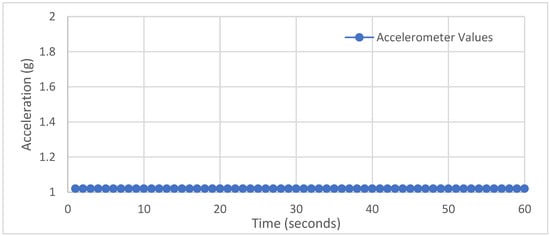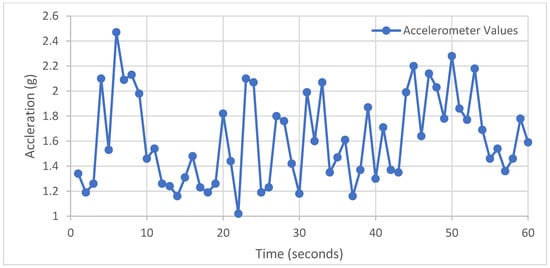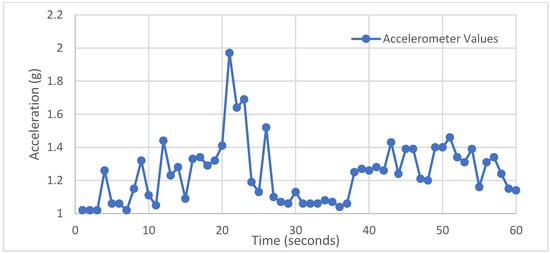 The Acc signal acquisition was carried out for 1 min in real-time. The signal can only react to the apparent motion of the body. Under stillness, no extremes were found, and the accelerometer maintained a constant value without any extremes, so the |Δαmag| maintained a constant value without unnecessary interruptions. Hence, the |Δαmag| was almost 1 at all times. Regular activities can cause sudden variations, but it is easy to realize that the signal behavior is random with tiny |Δαmag| at low frequencies. Likewise, if the user performs physical exercises, the Δαmag frequently varies with high repetitive extremes due to numerous motions that cause and |Δαmag| fluctuations repetitively with similar values. To distinguish between normal activities and training, the CDA counts the number of extremes per a specified period (20 s) to decide whether the person is exercising. Additionally, pertinent literature indicates that the body’s temperature returns to standard levels approximately 20 min after exercise. Therefore, the timer is to count that period and adjust the temperature threshold accordingly at 37.5 °C, which is the maximum body temperature during exercising.