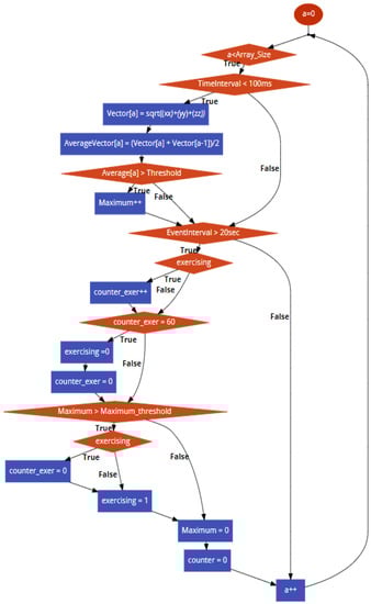 The CDA flowchart, in Figure 6, presents a comprehensive overview of the implemented algorithm. We gathered accelerometer data using the Vector Equation and stored the data into an array of 100 elements each time, calculating the average between two vector elements each time. After the data were stored into another array, a threshold was generated, computing the total average of the 100 elements. Values above that threshold were counted as local extreme values. If the local extremes were above a set value acting as a threshold, corporal activity was detected and adjusted the points accordingly. The following equation calculates the average vector: