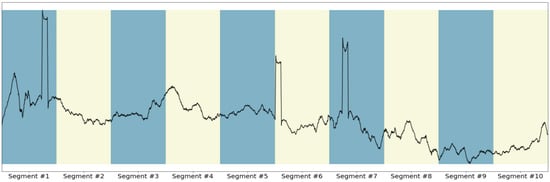 For the needs of our application, it was essential to parse the continuous-time series signals and create distinct segments that shall constitute the samples fed to the CNN. The dataset segmentation was carried out concerning a preconditioned timeframe, as illustrated in Figure 7, where the segmentation of an arbitrary signal was divided into 10 sections. Explicitly, for our application, a 5-min segment horizon was employed. Additionally, it is worth noting that an overlap of 75% between adjacent time windows was applied to maximize the number of available samples fed into the neural network. The 5-min input window with the 75% overlap yielded 250 samples across the two possible conditions of the user’s health (healthy and patient). These two states were equivalently represented in the dataset, as derived from the equal amount samples, respectively. Table 3 demonstrates the distribution of the samples to the training, validation, and test subsets for the neural net, respectively.