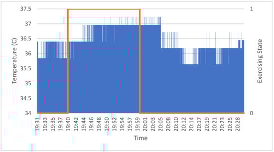 The user also measures the temperature several times during the day by using the infrared thermometer while taking off the device. The device was programmed such that the user just needs to place the infrared sensor on the forehead, upper wrist, armpit, and rectum. All the data are monitored via BLE through a device for some time because the infrared sensor does not require high amounts of sampling plus time; hence, results can be measured by hand. Figure 11 illustrates the exercise time, and the orange line showcases the Boolean value of the quarantined person. Additionally, in the mentioned period, we witnessed the fluctuations in body temperature as time passed 20 min. It returned to normal after the exercising time passed, and the temperature returned to normal after ~10–20 min of exercising ended. Given the exercise information, the people responsible for the person in quarantine can acquire an accurate image of how this graph works and how the temperature fluctuates with exercise.