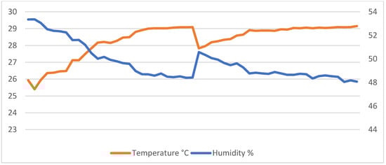 The data were used to demonstrate that the person that was monitored during quarantine had normal body conditions without fever while trying to maintain optimal room conditions, evincing that the designed system successfully tracked the person’s homeostasis under the COVID-19 pandemic. After using the device for an adjusted period, the user reported that the device had provided accurate information for the supervising people. Additionally, the patient’s family members were able to follow the temperature conditions as well as the ambient conditions (Figure 12), enabling them to take appropriate initiatives according to the data provided by the device (Table 6).