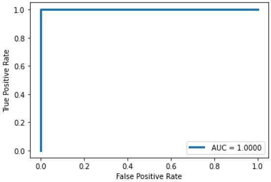 For the selection of hyperparameters, we consulted [44], where unidimensional CNNs were employed to carry out Condition-Based Monitoring in-vessel equipment. The architecture of the networks, along with the applied value of other significant hyperparameters, such as the optimizer’s learning rate or the batch size, is tabulated in Table 7. The results of the experiments established the efficacy of the 1D-CNNs in identifying feverish symptoms to the user. Multiple runs were carried out to ensure the validity of our results. All 30 experiments yielded the same results, as shown in Figure 13 and Table 8. Explicitly, Table 8 presents the confusion matrix of the classifications demonstrating that the networks correctly classified every sample in the test set. Additionally, Figure 13 illustrates the Receiver Operating Characteristic (ROC) curve and the equivalent Area Under Curve (AUC) value, evincing the perfect classification carried out by our proposed classifier.