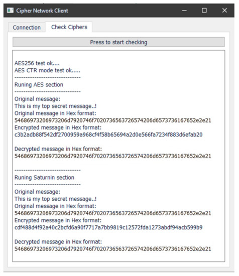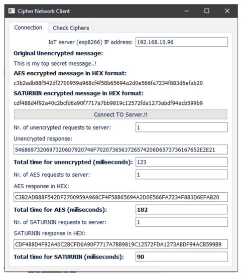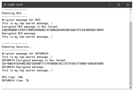 In order to illustrate more clearly the comparison between AES and Saturnin in terms of performance, the server repeats, for both cases, the encryption algorithm 500 times and, at the subsequent iteration, it sends the encrypted message to the “client”. In other words, we deliberately introduced the same encryption delays for both cases, since otherwise the time needed for encryption was negligible to be measured by the software. By these means, the server encrypts 16,032 bytes ( bytes) in total.