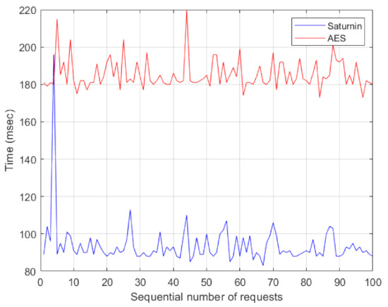 For a more concrete comparative study, we also estimated the mean value of all RTTs measured, for each case (AES and Saturnin). By these means, we can verify that the mean value of the RTT for the Saturnin was ms, whereas the corresponding value for AES was ms.