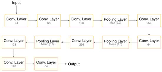 Building block-based CNN architecture with the best validation performance: fully convolutional network architecture with nine convolutional layers, one max pooling layer and two mean pooling layers.