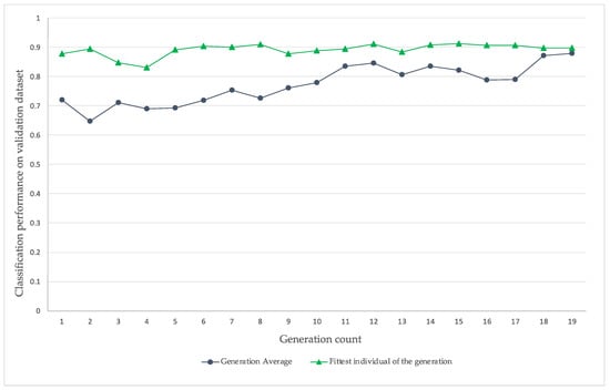 The fittest individuals varied among the generations and therefore, the fittest individual was selected for each generation and plotted in Figure 6. Thus, the graph does not represent the classification performance progression of one single individual, i.e., one network architecture design solution. Despite having fit individuals with good performance after the first generation, the top performances improved only slowly over the course of 19 generations.