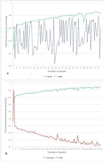 CNN-GA classification performance for selected individuals during training. (a) Selected individuals “15” and “09” from generation 15; (b) best-performing model overall of all 19 generations (individual identifier: 14–15).