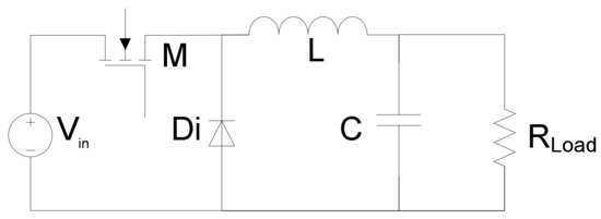 The buck converter (Figure 1) is composed of two semiconductors—a diode (Di) and a transistor (M), and two reactive elements—an inductor (L), and a capacitor (C). It can operate in two conduction modes: continuous conduction (CCM) and discontinuous conduction mode (DCM). The DCM will rise if the inductor current reaches a zero value.