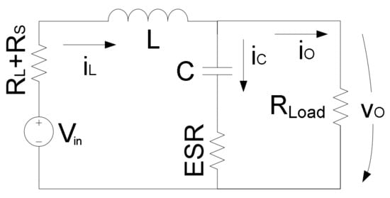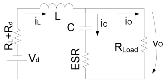 where Vin, RL, L, RS, Vd, Rd, C, ESR, RLoad, iL, iC, iO, vO and vC, represent the input voltage, inductor resistance, inductor inductance, drain-source resistance, diode forward voltage drop, diode internal resistance, capacitor capacitance, capacitor internal resistance, load resistance, inductor current, capacitor current, load current, output voltage and output voltage component due exclusively to C, respectively.