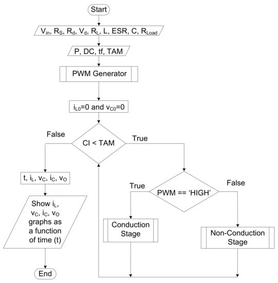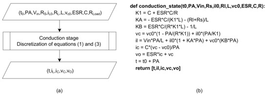 Thus, after discretizing Equation (1), it is possible to construct a function that describes the operation of the converter during the conduction state (Figure 4). This function must receive as input arguments the initial time, t0, the sampling period, PA, the characteristics of the converter (Vin, RS, L, ESR, C and RLoad) and the initial conditions (the inductor current, iL0, and capacitor voltage, vC0, at the initial time).