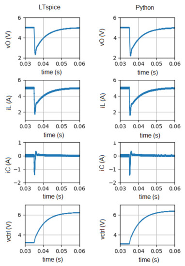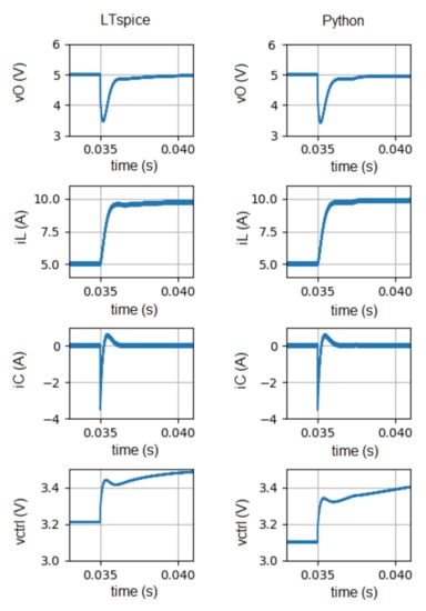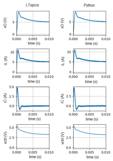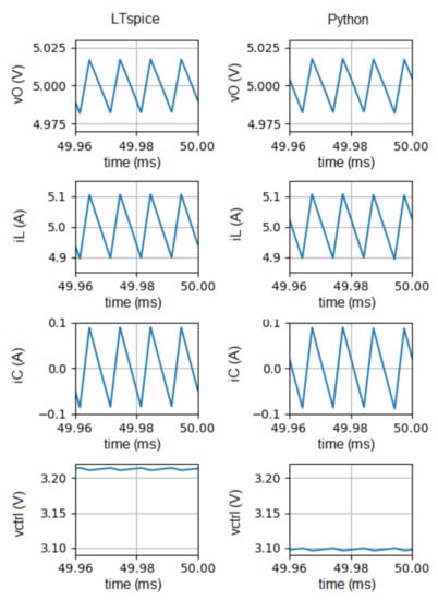 Figure 11, Figure 12, Figure 13 and Figure 14 show the waveforms of the output voltage (vO), inductor current (iL), capacitor current (iC) and control voltage (vctrl) obtained with the proposed technique and in LTspice. vctrl shows a slight difference between both simulations, which is essentially due to the time taken by the MOSFET to switch. This time period is not taken into account in Python simulation.
