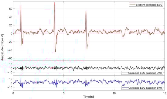 Several denoising techniques have been developed for the purpose of artifact correction in EEG signals [6,7,8]. Rejecting artifactual portions of the EEGs is the simplest way, which deletes epochs containing artifacts. However, removal of artifactual portions can be a time-consuming process that can lead to significant information loss, which is in turn detrimental for data analysis [6]. Traditionally, regression and linear filtering-based analyses are employed to reject artifactual noises from corrupted signals [8]. Due to the overlap of brain activities and artifactual noises in the spectrum of an EEG signal, filtering them in either the frequency-domain or the time-domain may result in loss or distortion of physiological activity [9]. Regression-based methods rely on an extra one or more regressive channels, which gives rise to a fundamental weakness in that the spectral range of some artifacts overlaps with the spectral range of an EEG signal [10]. In both the temporal and frequency domains, wavelet transform-based analysis has been proven to be more efficient in repairing EEG artifacts while keeping the original EEG signal [11,12].