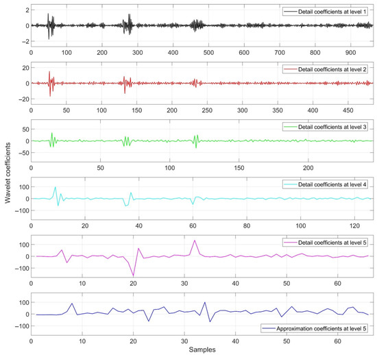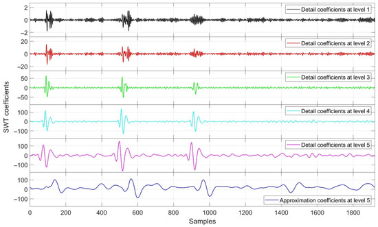 Generally, there are two types of wavelet transform: one is the discrete wavelet transform (DWT) and another is a continuous wavelet transform (CWT) [15]. DWT is regarded as a non-redundant and extremely dynamic wavelet transform for obtaining wavelet representation of signal [16,17]. In DWT, the signal is passed through a half-band high-pass and a half-band low-pass filter, resulting in detail coefficients and approximate coefficients, respectively. The process continues until the expected frequency is obtained. The time-variance of DWT is a severe flaw, which is especially critical in statistical signal processing applications such as EEG [18]. The stationary wavelet transform (SWT) solves the DWT’s translation invariance problem; however, it has redundant information and is sluggish [19]. The filter at each stage is the design difference between DWT and SWT [20]. At each level of decomposition, the approximate and detail sequences are the same length as the original sequence. Wavelet coefficients extracted through SWT are shown in Figure 4, and the corrected EEG signal is illustrated in the bottom panel of Figure 2 in blue.
