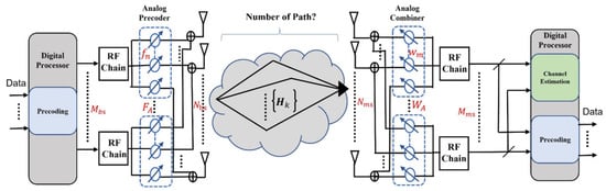 Millimeter wave (mmWave) transmission technology is an attractive candidate technology for next-generation wireless communication systems []. The main benefit of utilizing mmWave carrier frequencies is the larger spectral bandwidth available for higher data rates facilitating the ever-increasing communication traffic []. To compensate for the significant path-loss at such high frequencies, large antenna arrays are common at both the base station (BS) and the mobile station (MS) to provide sufficient beamforming gain []. Compared to conventional multiple-input multiple-output (MIMO) systems, the large antenna arrays in mmWave systems make it unlikely to have a dedicated radio frequency (RF) chain for each antenna without costly hardware []. A hybrid analog/digital structure uses fewer RF chains to reduce the number of power-consuming devices, such as analog-to-digital converters (ADCs) or digital-to-analog converters (DACs) []. To achieve considerable beamforming gain in the precoding stage, accurate channel state information (CSI) is required through channel estimation.