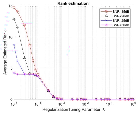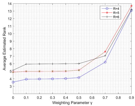 The rank estimation performance versus different and ranks is shown in Figure 9. In this simulation, we assume the true rank R = 4, 5, and 6, = , SNR = 20 dB. When in (28) the proposed algorithm is equivalent to l1 regularization LS (11). It can be observed that the average estimated ranks are very close to the true ranks with weighting parameter from 0.1 to 0.4. Otherwise, we get large rank estimation errors.
