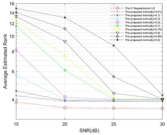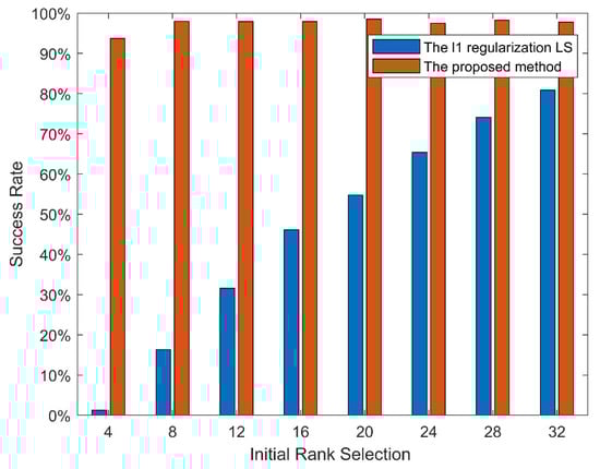The performance comparisons between the proposed method and the l1 regularization LS () in terms of success rate for different values of with same initial rank 24 are shown in Figure 6. It shows the proposed method with some values of can achieve much better rank estimation success rate than that of the baseline l1 regularization method when SNR = 20 dB. For example, the rank estimation success rate is above 98% when = 0.3.