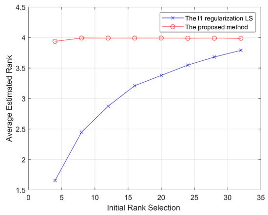 The comparison between the proposed method and the l1 regularization LS in terms of robustness is shown in Figure 4. The simulation is based on the true rank R = 4, =, = 0.3, SNR = 20 dB. We select the initial rank as some integers between 4 and 32 and calculate the estimated rank with the same stop criterion. The selection of the upper bound of the initial rank is bounded by the characteristics of , and . We make these three Khatri-Rao products as overdetermined matrices to guarantee the ALS-based method has a unique solution. So, It can be observed from Figure 4 that the proposed method (the top red line) converges to the real rank R = 4 under the different initializations, while l1 regularization LS method only converges at a large initial . Thus, the rank estimation performance of the proposed method is much more robust than that of the l1 regularization LS in terms of initialization.