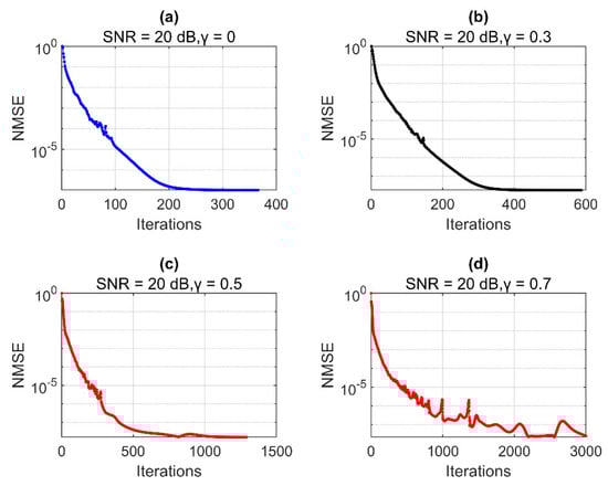 The plots in Figure 7a–d show the relative error versus the number of iterations converging to the threshold when 0, 0.3, 0.5, 0.7, respectively. For example, the proposed method takes about 300 iterations to reach the threshold in Figure 7b, compared to the baseline l1 regularization with roughly 200 iterations in Figure 7a. Rank estimation is crucial for channel estimation when the number of multipath is unknown. It is worthy to get a significantly improved rank estimation success rate at the expense of slightly more iterations.