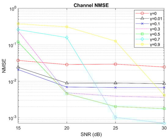 We then turn to the overall channel estimation performance of our proposed scheme, which is measured by the normalized mean squared error: Channel NMSE = . Figure 8 depicts the channel NMSE performance versus the system SNR derived by the proposed scheme, which is compared with that of l1 regularization LS method (). It is observed that some values of (i.e., at SNR = 20 dB) give us smaller NMSE or better channel estimation performance.
