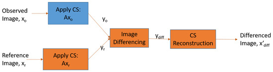 CS architecture. The blue block represents CS data acquisition, which can be performed on-board a spaceflight instrument, while the orange blocks represent computations, which can be performed on the ground.