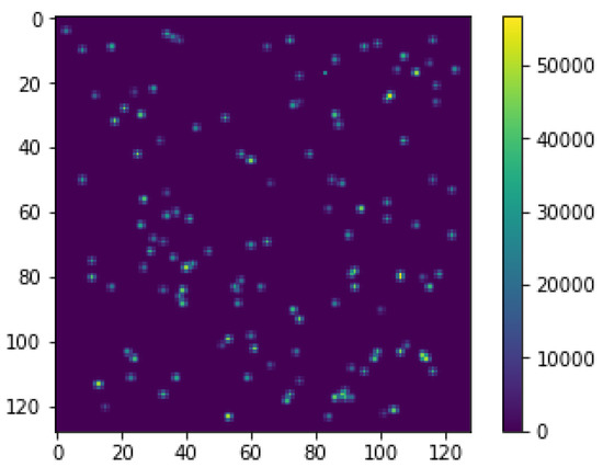 - Generate a spatial sky image of size n × n using uniform random distribution, in the range of 50 and 5000 pixel value. The radius of these star sources are generated using an airy point spread function with an aperture radius between 1 and 5 pixel units, which is randomly chosen.