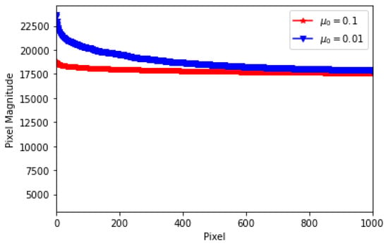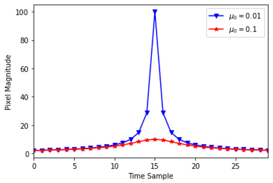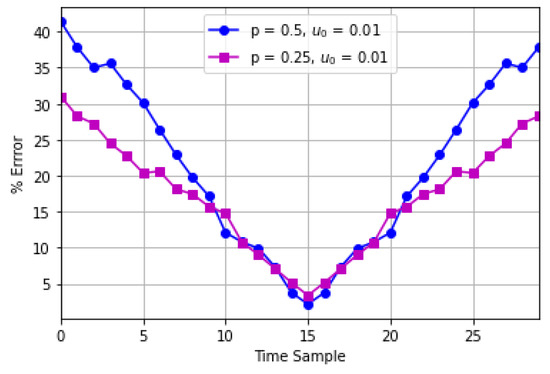 Figure 12 and Figure 13 show that for high-magnification pixels in the time-series light curve (as shown in Figure 5), the Poisson noise error is lowest at those time samples, as compared to the low-magnification time samples. In addition, we show that by decreasing p of the Binomial matrix, A, we can decrease the noise error by an average of over all time samples for and for .
