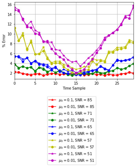 From Equation (16), we get the total noise variance for added Gaussian source noise with noise variance, , as shown in Table 1. We obtain the average over 100 Monte Carlo simulations of A.