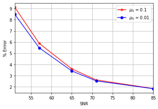 In Figure 8, we can note that the % error is the lowest when the magnification peaks at , as shown in Figure 5. We also see the effect of the different levels of noise on the % error. Figure 9 shows the comparison between and . As the SNR decreases, the % error difference between the two also increases. For high-magnification events, where is lower, sparsity is higher. Thus, the % error is lower in those circumstances, as noted in Figure 9. From Figure 8 and Figure 9, it is evident that for low SNR images, CS reconstruction works better when the impact factor , as opposed to when . A summarizing result from this figure is that CS works well for high-magnification images, even with addition of noise, following the need for sparsity in signals for accurate CS reconstruction.
