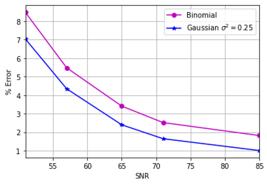 Graph of % error for an image with added Gaussian source noise for a single-lensed microlensing event with . Binomial and Gaussian measurement matrices, with the given variance, are used for comparison.