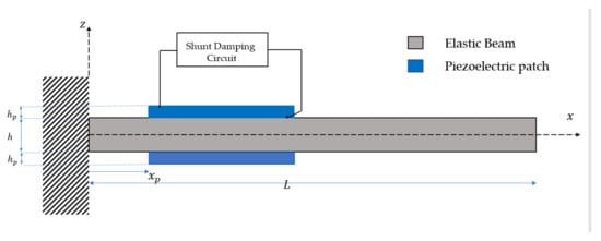 Figure 1 shows the system under study which consists of a cantilever host beam made of an elastic material with two piezoelectric patches bonded on its top and bottom surfaces at distance from the fix end. It is assumed that the layers are bounded perfectly, and the bond between them is negligible. The host beam has length L, thickness h and width b. The -plane is the beam’s midplane, and the longitudinal and thickness axes are located in the - and -direction, respectively. The poling direction of the piezoelectric patches is assumed to be along the z-axis. Additionally, it is assumed that they are covered by fully conductive electrodes of negligible thickness. The electrodes of the top patch are connected to a passive shunt circuit. The bottom piezoelectric patch can be used as actuator. All the layers, piezoelectric and elastic, are considered to be thin so that the plane stress state can be applied.