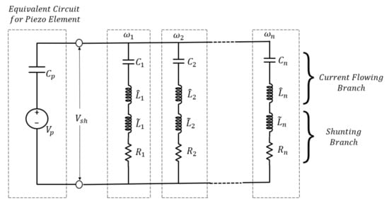 The “current-flowing” shunt circuit is shown in Figure 2. Each circuit branch of the “current-flowing” shunt corresponds to the structural mode chosen to be damped and consists of two sub-branches: a current-flowing branch and a series single-mode shunt-damping branch . The current-flowing sub-branch is tuned at the target resonance frequency of the structural system and is an approximately open circuit at all the other frequencies. This is achieved by selecting and so that: