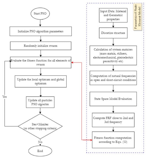 The rest of the paper is organized as follows. Section 2 presents the proposed method for enhancing the multimode vibration damping of composite beam structures. More precisely, in Section 2.1, a finite-element model for laminated composite piezoelectric beams is developed, Section 2.2 briefly describes the “current-flowing” multimode shunt-damping method and Section 2.3 provides the state-space representation of the shunt-damping system when a “current-flowing” shunt circuit is connected to the top piezoelectric patch. The section ends with the presentation of the proposed design optimization approach for multimode vibration control. The method considers the capacitances and the shunting branch inductors as new design variables along with the resistor damping components. The proposed optimization approach uses a particle swarm optimization (PSO) algorithm to minimize the norm of the damped system. To investigate in detail the effect of these variables on the damping performance, as well as for comparison with the other methods proposed previously in the literature [15,17,18], two additional numerical examples with fewer design variables are addressed. Simulation results are shown in Section 3 to verify the proposed design optimization approach. In addition, a comparison of the proposed PSO method with the GA algorithm is provided in Section 3.6 to demonstrate the capability of the proposed PSO method to improve the performance of shunt-damping circuits. Finally, in Section 4, a review of the work and a summary of the principal conclusions of this study are outlined.