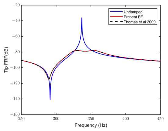 Beam tip FRF with RL shunt tuned on mode 2: undamped response (blue ---), damped—present FE (red), damped FE of Thomas et al., 2009 [24] (black).