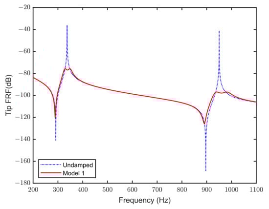 In this case, the optimization problem described by Equation (55) is solved by setting the lower and upper bounds for the resistance values to be the same as in model 1 (see Table 3). The capacitance values are chosen to be 10% of the inherent capacitance of the piezoelectric patch, and the inductance values are given by Equation (35). The optimal values of the resistance variables found by the PSO algorithm are and . Figure 8 shows the magnitude of the tip FRF, before and after shunt damping, using the method proposed by Behrens et al. [16] (model 2). For comparison reasons, the corresponding FRF of the damped system using the proposed method (model 1) is also illustrated simultaneously in this figure. It is obvious from Figure 8 that the proposed method provides greater amplitude reduction in both target modes. Indeed, the FRF amplitude reduction of the second mode is 25.47 dB, i.e., 35.69% lower compared with that of model 1 (39.61 dB). Additionally, the FRF amplitude reduction of the third mode is 47.08 dB, i.e., 15.81% lower compared with that of model 1 (55.92 dB). The overall parameters of the shunt circuit for model 2 are shown in Table 6. It can be observed that the required inductance values for the convectional current-flowing method (model 2) are considerably large, especially those corresponding to low-frequency modes. In comparison with the optimal inductance values of model 1, it follows that the suitable choice of the capacitance values via the proposed optimization method significantly reduces the inductive requirements.