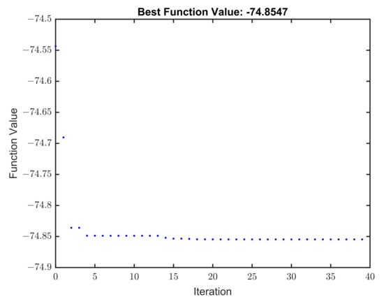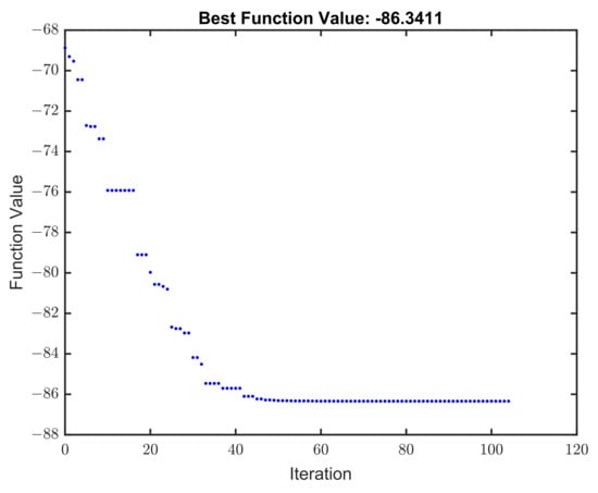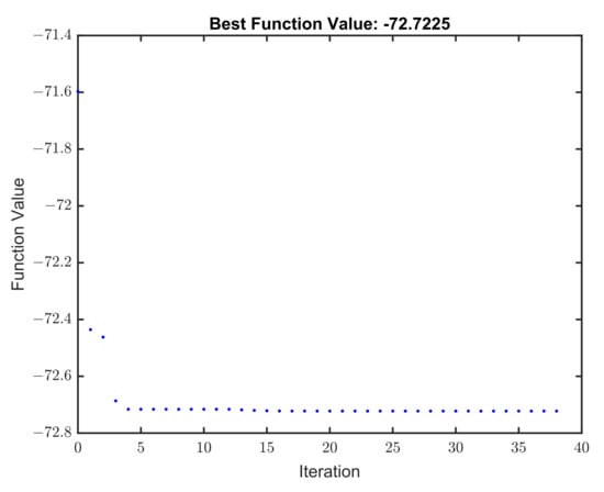 Figure 7 shows the convergence of the particle swarm optimization algorithm for model 1. As can be seen from Figure 7, the process converges after generation 45, when the fitness function remains quasi constant. It takes about 1 h to carry out the 105 iterations. In addition, the algorithm stops before the maximum iteration is reached, since the relative changes in objective function are less than the tolerance (10−6).