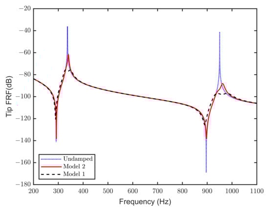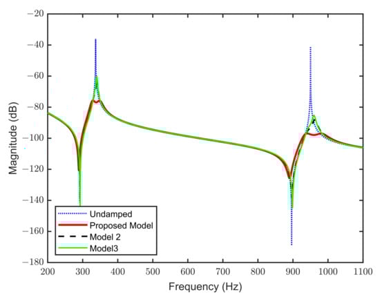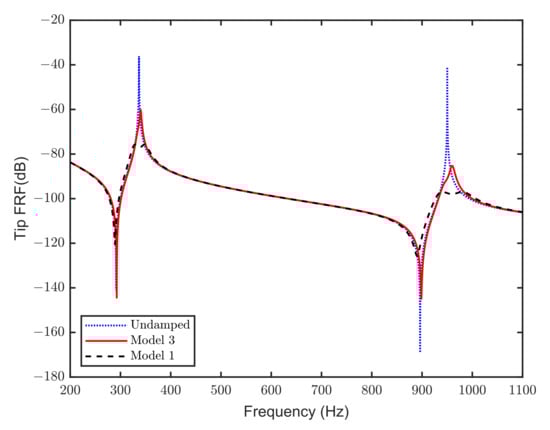 An overall comparison between the three models is given in this section. For this reason, the tip FRFs using optimal solutions of all models are illustrated simultaneously in Figure 12. It can be observed from this figure that the optimal solution of the proposed model 1 gives greater amplitude reduction than both the other models. This means that the proposed model 1 yields better results than all the other models. The same conclusion can be obtained by comparing the amplitude reduction for the second and the third mode for all models given in Table 8.