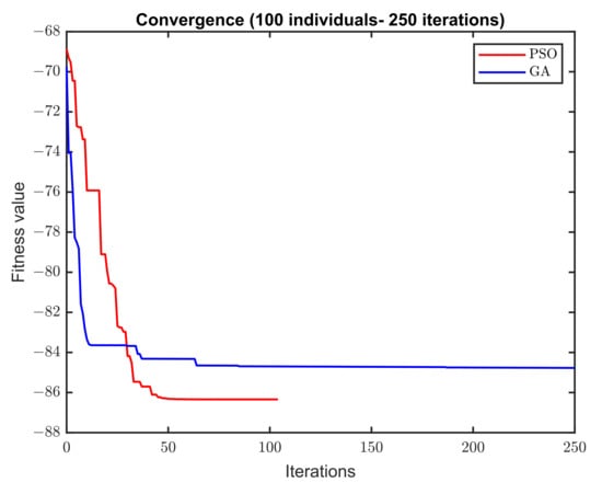 Figure 13 shows a comparison of the PSO and GA methodologies’ convergence during the search process of the optimal parameters for the test run (execution) with the best fitness value. It is clear from this figure that PSO converges at a faster rate (around 45 iterations) than GA (around 232 generations). Another interesting outcome of this figure is that, in GA, although the best solution is improved relatively fast in the first 70 iterations, in the remaining iterations, it is trapped in a local optimum, which is worster from the solution found using the PSO. Thus, this comparison demonstrates the capability of PSO to reach better values for this kind of problem and exert less computational effort to reach the “optimum” when compared to GA. Nevertheless, a more comprehensive study is needed to establish this statement, which is out of the scope of this study.