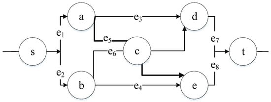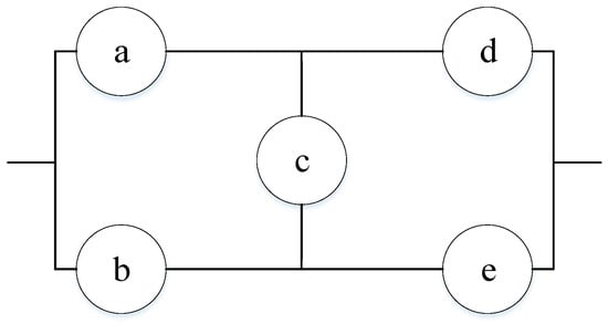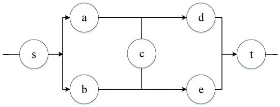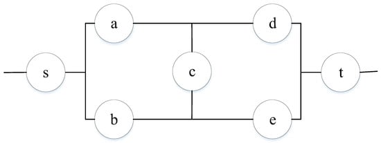 Moreover, considering that the current research on MFN reliability has been less applied to a bridge network (as shown in Figure 1), in which the symbols a, b, c, d, and e represent five nodes that are connected by edges, this study is based on a bridge network and expands it to add a source node and a sink node (as shown in Figure 2), in which the symbols s and t represent the source node and the sink node, respectively. The multi-stage traffic network map used in this study is an innovative network diagram. This study-extended bridge network is shown in Figure 2 as an example, where it has been applied to logistics distribution from north to south in Taiwan to evaluate MFN reliability considering road conditions with different speed limits.