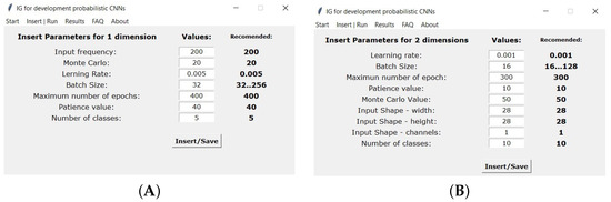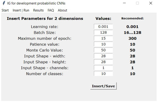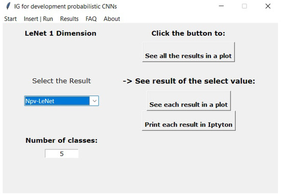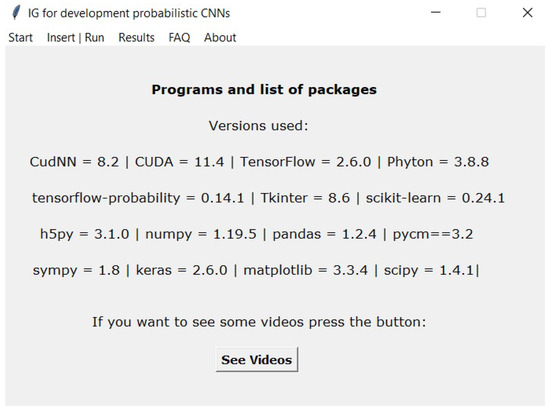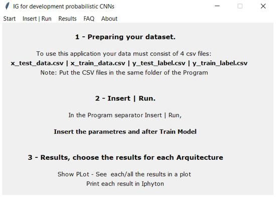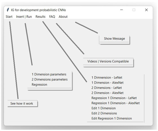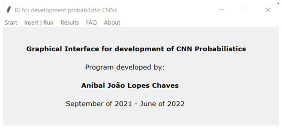 The entire code was developed in Python 3, including the GUI and the development of the models, and is available (in open source) in the public repository: (https://github.com/achaves37/Interface-Grafica-para-desenvolvimento-de-Redes-Neuronais-Convolucionais-Probabiliticas/, accessed on 2 February 2023). Two versions are provided, one called “TestInterface” and another called “Interface”. In the latter, the user will need to load his data sets, which are intended to be used for developing the custom models. In contrast, the first uses standard ML datasets (useful for testing proposed architectures and getting familiarized with the interface). All the code is documented and organized to make it possible to add/edit some models in a simple and direct way. It is recommended that users be familiar with basic operations with a Python console [11]. The user and the program interact through Tkinter [12] and IPython. The PMs were also developed in Python, using the TF libraries. However, the computational performance is not affected by the choice of this language because TF internally converts the models described for the compute unified device architecture (CUDA) [13], C++, and is optimized for GPU use.