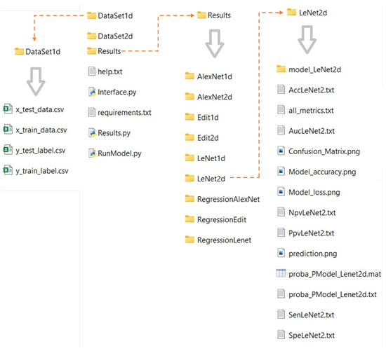 In Figure 2, the “Start” tab is presented, where GUI provides information regarding its use for all datasets. The GUI obtains data from four comma-separated value (CSV) files (stored in specific folders such as DataSet1d or DataSet2d for one- or two-dimensional classification data, respectively), using one for training data, one for training labels, one for testing data, and one for testing labels. The data for training and testing must be organized in rows, where each row represents a sample, and each column denotes a feature of the sample. If two-dimensional data are being used, they must be flattened, and the program will internally recreate the original shape to feed the models. Additionally, the labels file should have one row for each sample in the data file (matching the raw number in the files) and be encoded in decimal or one hot encoding. The user can carry out preprocessing of the data, such as normalization or standardization, and the result can be stored in the data CSV files. All generated results will also be stored in folders according to the used model, as shown in Figure 3.
