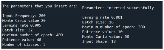 The subsequent tab called “Insert|Run” is shown in Figure 4. Here, the user can introduce the parameters that will control the models’ training. If necessary, the user can compare with the recommended values. These values are already pre-filled, and if the user wants to use those values, he only has to click on the “Insert|Save” button. Otherwise, the user must insert the values and then press the button. By pressing the button, the confirmation message is shown on the IPython console (for visual confirmation of the parameters previously inserted), as shown in the example of Figure 5. The left side of the Figure 5 is for classification using a one-dimensional data set, and the right side is for a regression two-dimensional data set using. The user can also perform regression with one-dimensional data and classification with two-dimensional data. If needed to expand to higher dimensions, the user can add new modules (or edit an existing one) to the GUI, copying the code from the two-dimensional models and changing the number of dimensions to the desired value.