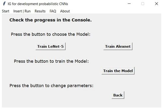 The developed GUI presents multiple options that guide the user in the process of selecting the architecture of the ANN to be developed, defining the training procedure, and obtaining the resulting model in a simple and intuitive manner. However, it also allows the inexperienced user to train models with a small number of choices using the pre-defined recommended values for the options. It is only necessary to load the data sets, select the desired model, and start training it. Essentially, the developed GUI was designed to allow the development of a probabilistic CNN to be done in three steps: insertion of the desired parameters for training and choice of the architecture; training of the model; and visualization of the results.