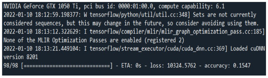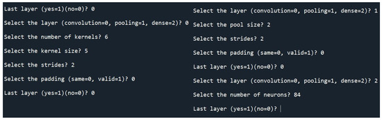 After pressing the “Train Model” button, the program starts training the selected model. Figure 7 shows the console indicating the progress in training the model. Furthermore, the user can create the model by inserting it layer by layer, having to select the layer type; in this case, convolution, pooling, or dense. The insertion window is shown in Figure 8.
