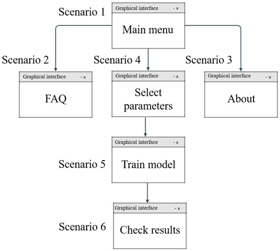 The second iteration was a discussion with GUI specialists on how to properly present all functionalities while using a simple functionality-oriented interface. After defining the desired entity-relationship model and the use case diagram, a navigation map was proposed with six main scenarios as depicted in Figure 12. These scenarios were as follows: