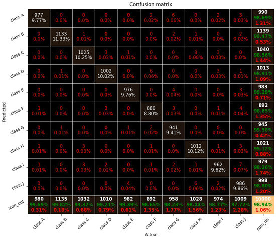 Figure 16. Confusion matrix for the LeNet-5 model, trained on a two-dimensional dataset (MNIST). Correct (in green) and wrong (in red). - Model’s epistemic uncertainty, shown in Figure 17.