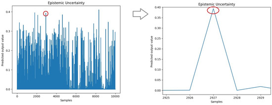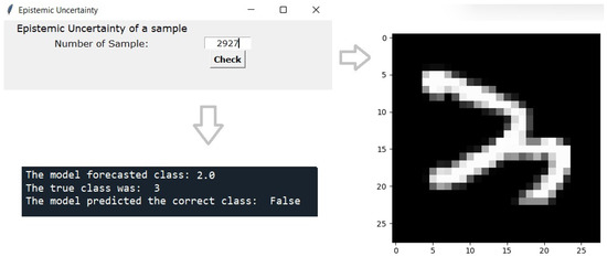 On the left side of Figure 17, the epistemic uncertainty of the trained model is presented. In this example, one of the points where the uncertainty is higher is chosen, and on the right side, a zoom is performed to identify the sample number. After attaining the sample number, it can then be further analyzed as presented in Figure 18. Pressing the “Check” button the sample is presented. Through IPython, it is possible to check into which class the model classified the sample, what was its true class, and the result of the model classification. It is possible to observe that the model classified the sample number 2927 as class 2. Its true class was 3, that is, the model failed to classify the sample correctly. Finally, in Figure 19, the epistemic uncertainty distributed over the various classes is shown.
