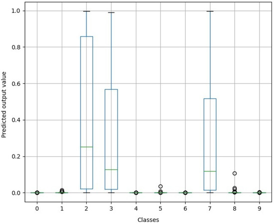 Epistemic uncertainty distributed across the various classes, relative to the LeNet-5 model for the two-dimensional dataset (MNIST). The green line is the median of the class data.