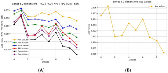 Example of the plots depicted when choosing (A) “See all the results in a plot” and (B) “See each result in a plot”, relative to the example using the LeNet-5 model for the two-dimensional dataset (MNIST).